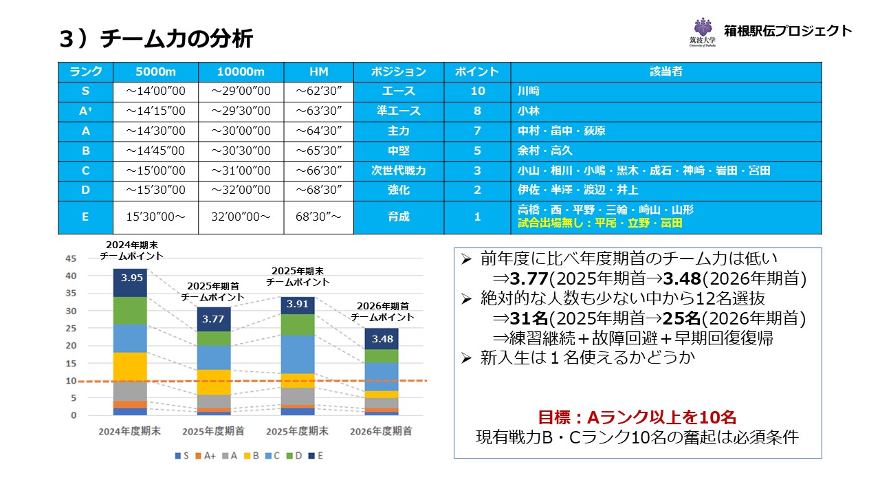チーム力は上記の通り前年度に比べ期首のチーム力は弱いです(3.77⇒3.48)。また例年以上にチームメンバー数も減少しています(31名⇒25名)。ということは、例年以上に厳しい強化に取り組み、かつ故障を回避しつつ、万が一故障した場合でも早期回復に努めることが重要になってきます。幸い冬場にレースに出れなかったBランクの余村、高久も復帰の目途が立っていますし、Cランクが8名と一段上がれば大幅な戦力強化となる希望があります。