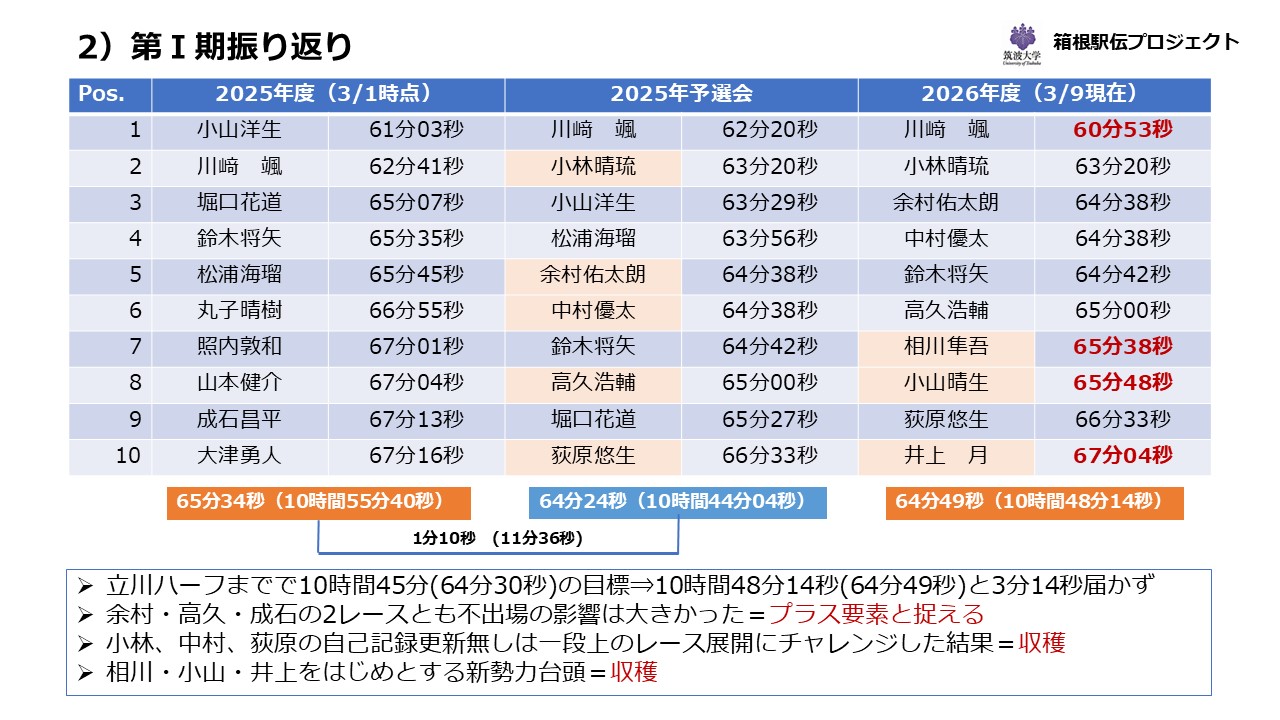一方で、冬季強化期間のチーム目標として掲げた「10時間45分00秒(64分30秒)」には3分14秒届きませんでした。川﨑、相川、小山、井上の大幅自己記録更新の一方で小林、余村、中村、高久、荻原の昨年度の予選会メンバーの上乗せが出来なかったことは反省点となります。特に余村、高久、成石の故障回復が思ったより長引き2レースとも不出場となってしまった影響は大きかったと考えられますが、逆に戻ってきてくれた際のプラス要素ととらえて行ければと思います。また、学生ハーフの小林、立川シティハーフの中村、荻原は一段上の強化、調整の流れに取り組み、レース展開も一段上の流れにチャレンジした結果ですので収穫だと言えます。