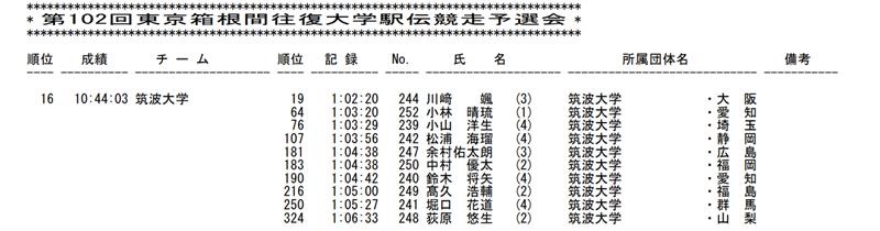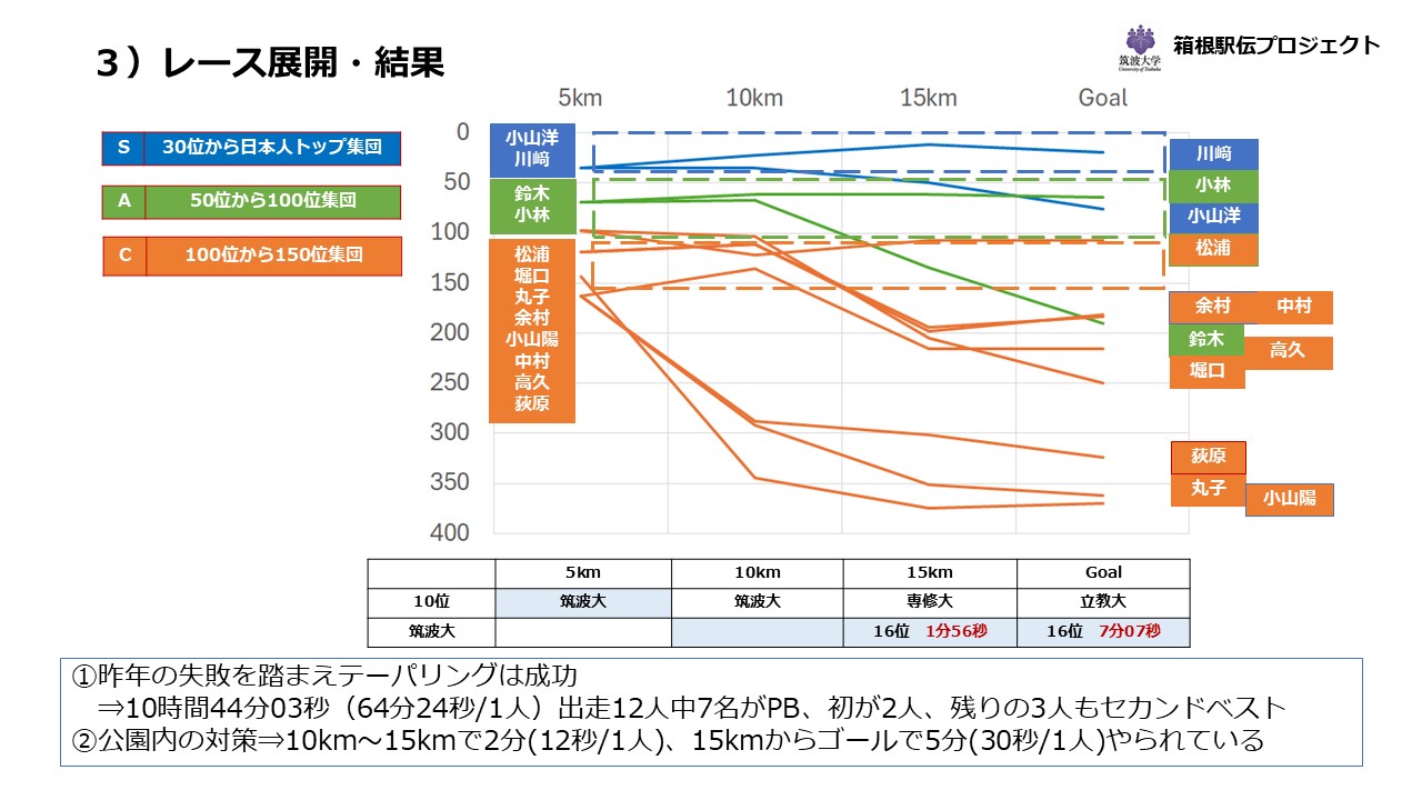 筑波大学の12名の選手の各定点での順位推移は上図の通りです。川崎、小林、松浦の3名はやりたいことが出来たレースであったのではないかと想像できます。特に小林は出走42大学全1年生の中で2位という想像以上の地力を発揮してくれました。小山洋は少し夏の強化の疲労を残してしまい、流れに乗り切れず苦しみましたが、主将の責任感で何とか自分の役割を果たそうとしてくれたことが見て取れます。
