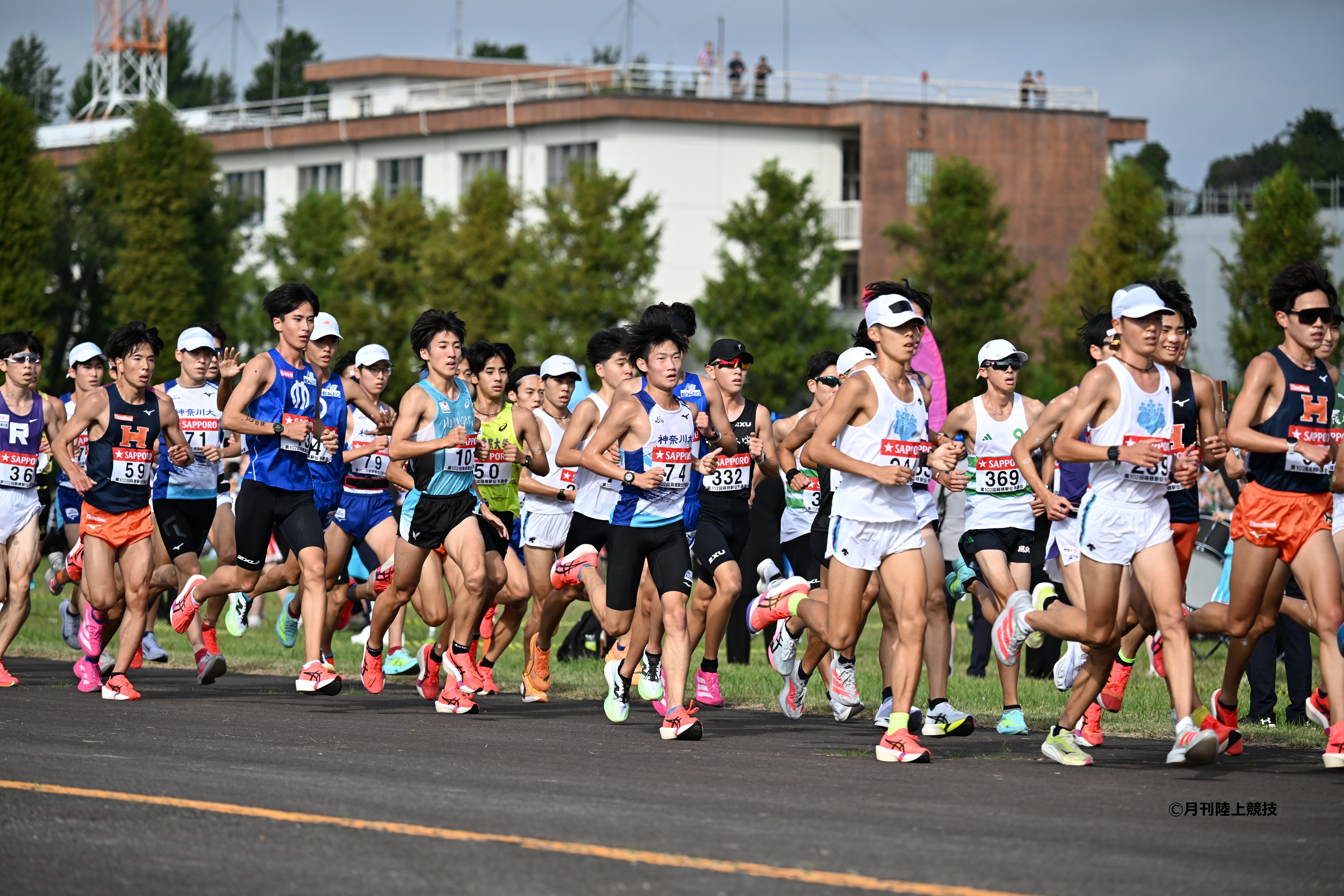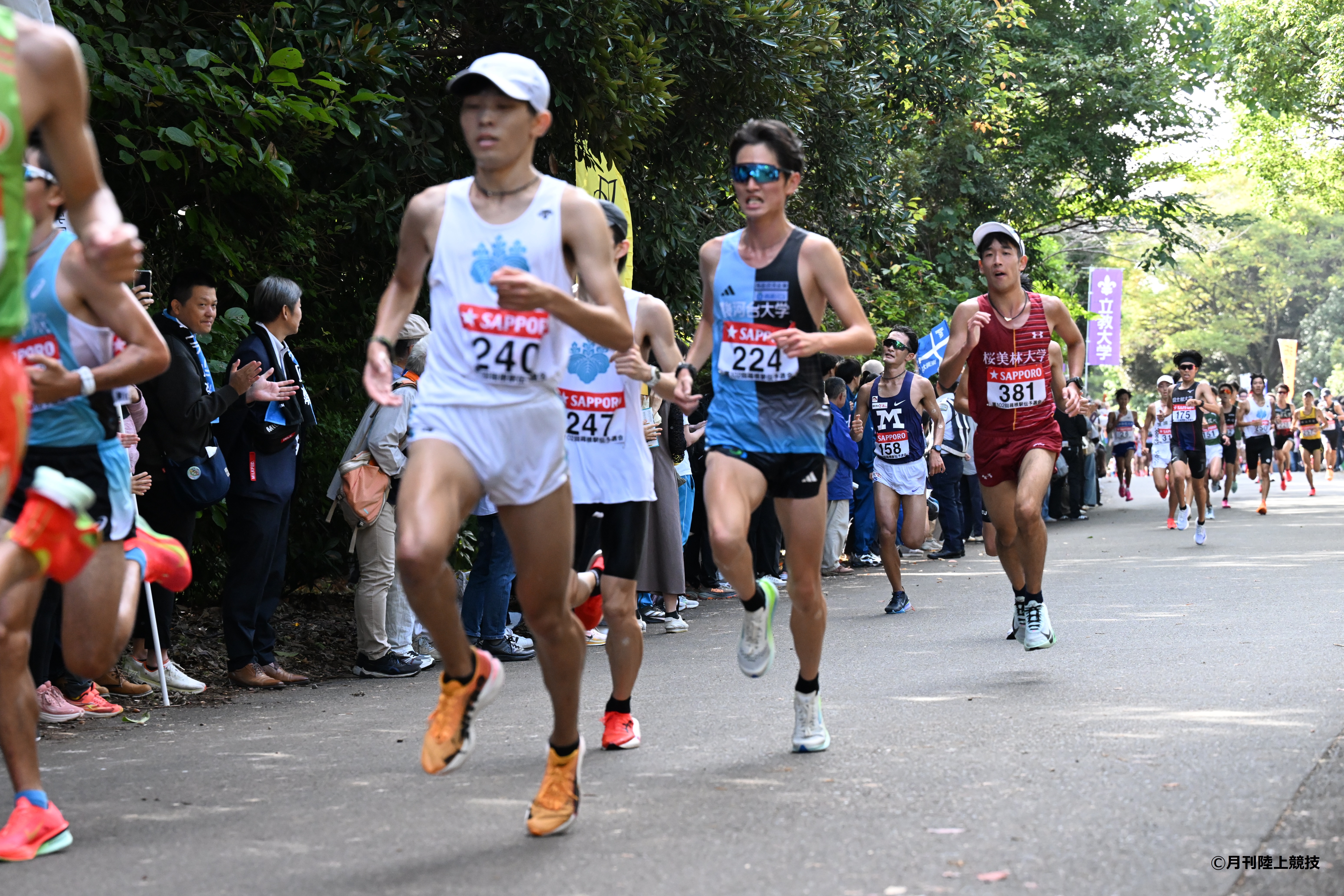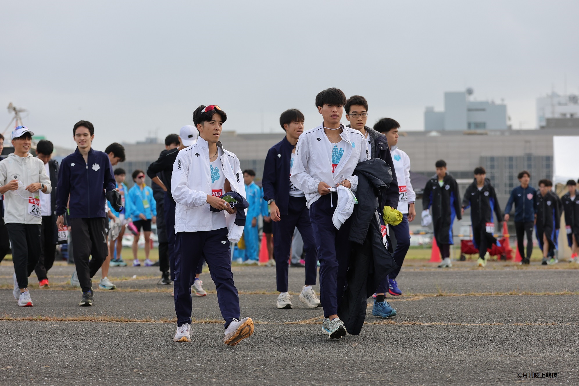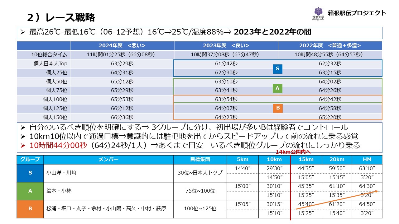 戦略としては、後半のペースアップを期待するよりも、常に通過ボーダーの流れに乗り10km通過順位を10番前後で通過して公園内を我慢し続けるというレース展開があっていると考え、また、予選会初出場、さらにはハーフマラソン初挑戦の選手が12名中5名いたため、小山洋生、川崎は日本人トップ集団、1年生の小林には関東インカレ代表などハーフマラソンの経験が豊富な鈴木を付け第2集団(50位から100位目安)、その他の8人を松浦、堀口、丸子の4年生にコントロールしてもらい少し落とし目で公園内に入るグループ(100位から150位)の3つで進め、小山洋、川崎の作ってくれた貯金を残り8人でやりくりしながらなんとか使い切らずゴールするよう準備をしてきました。